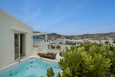 The strong presence of construction materials combined with the amazing view of Ornos Bay, will make you love the 35 sq.m. Vista Suite. The traditional fixed bed embraces the space and creates the appropriate balance needed in order to provide you with complete satisfaction and comfort.